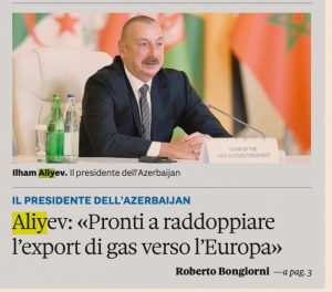 Azərbaycan Prezidenti müsahibəsində ölkəmizin təsdiq edilmiş təbii qaz ehtiyatlarının həcminin 2,6 trilyon kubmetr təşkil etdiyini, Avropaya nəql edilən qazın həcminin iki dəfə artırılmasının nəzərdə tutulduğunu, İtaliya, Yunanıstan və Bolqarıstanla müqavilələrin imzalandığını, qitənin digər ölkələrinə qaz nəqlinin qiymətləndirildiyini bildirib. Prezident İlham Əliyev İtaliyanın Azərbaycanın karbohidrogen resurslarını Avropanın digər yerlərinə ötürəcək ölkə olacağına əminliyini ifadə edib.