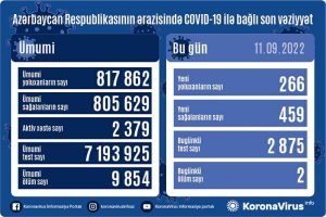 Azərbaycanda koronavirus (COVID-19) infeksiyasına 266 yeni yoluxma faktı qeydə alınıb, 459 nəfər müalicə olunaraq sağalıb.