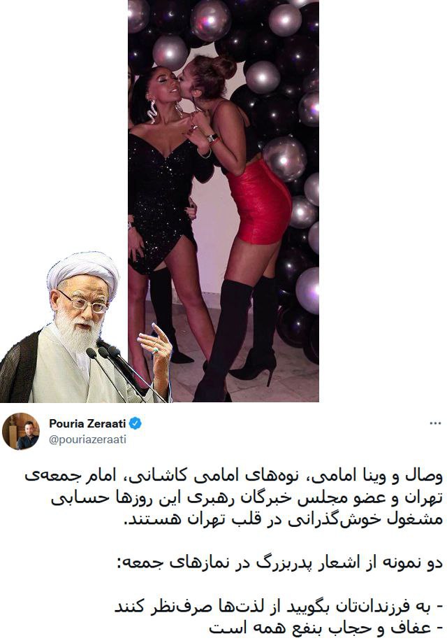 “Tehranın cümə imamı və Ekspertlər Şurasının üzvü Emami Kaşaninin qız nəvələri Vüsal və Vina Emami bu günlərdə Tehranın göbəyində əyləncəli həyat keçirməklə məşğuldurlar. Onların babası isə cümə namazlarında sadə və abırlı yaşamaqla bağlı xalqa davamlı tövsiyələr edir: Övladlarınıza deyin ki, ləzzətlərdən imtina etsinlər. İffət və hicab hamının xeyrinədir" - deyə o qeyd edib.