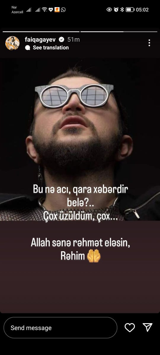 Bu barədə Xalq artisti Faiq Ağayev sosial şəbəkə hesabında paylaşım edib.