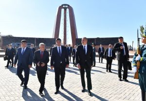 Prezident İlham Əliyev abidənin önünə əklil qoyub.