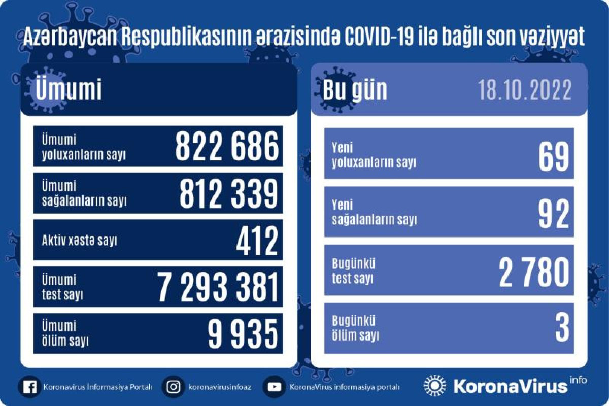Azərbaycan Respublikasında koronavirus (COVID-19) infeksiyasına 69 yeni yoluxma faktı qeydə alınıb, 92 nəfər müalicə olunaraq sağalıb.