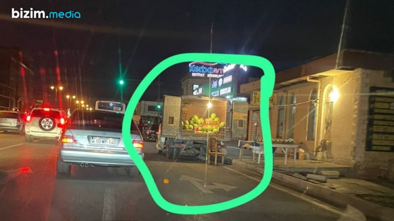 Bu barədə görüntü sosial şəbəkələrdə paylaşılıb. Fotodan da göründüyü kimi avtobus zolağında qarpız satılır.