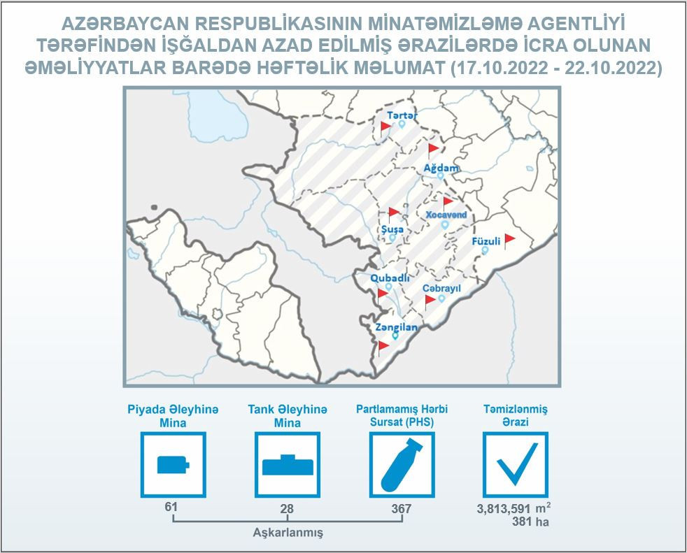 ANAMA-dan bildirilib ki, oktyabrın 17–dən 22-dək Tərtər, Ağdam, Füzuli, Şuşa, Qubadlı, Cəbrayıl və Zəngilanda 61 piyada əleyhinə mina, 28 tank əleyhinə mina və 367 partlamamış Hərbi Sursat (PHS) aşkarlanıb.