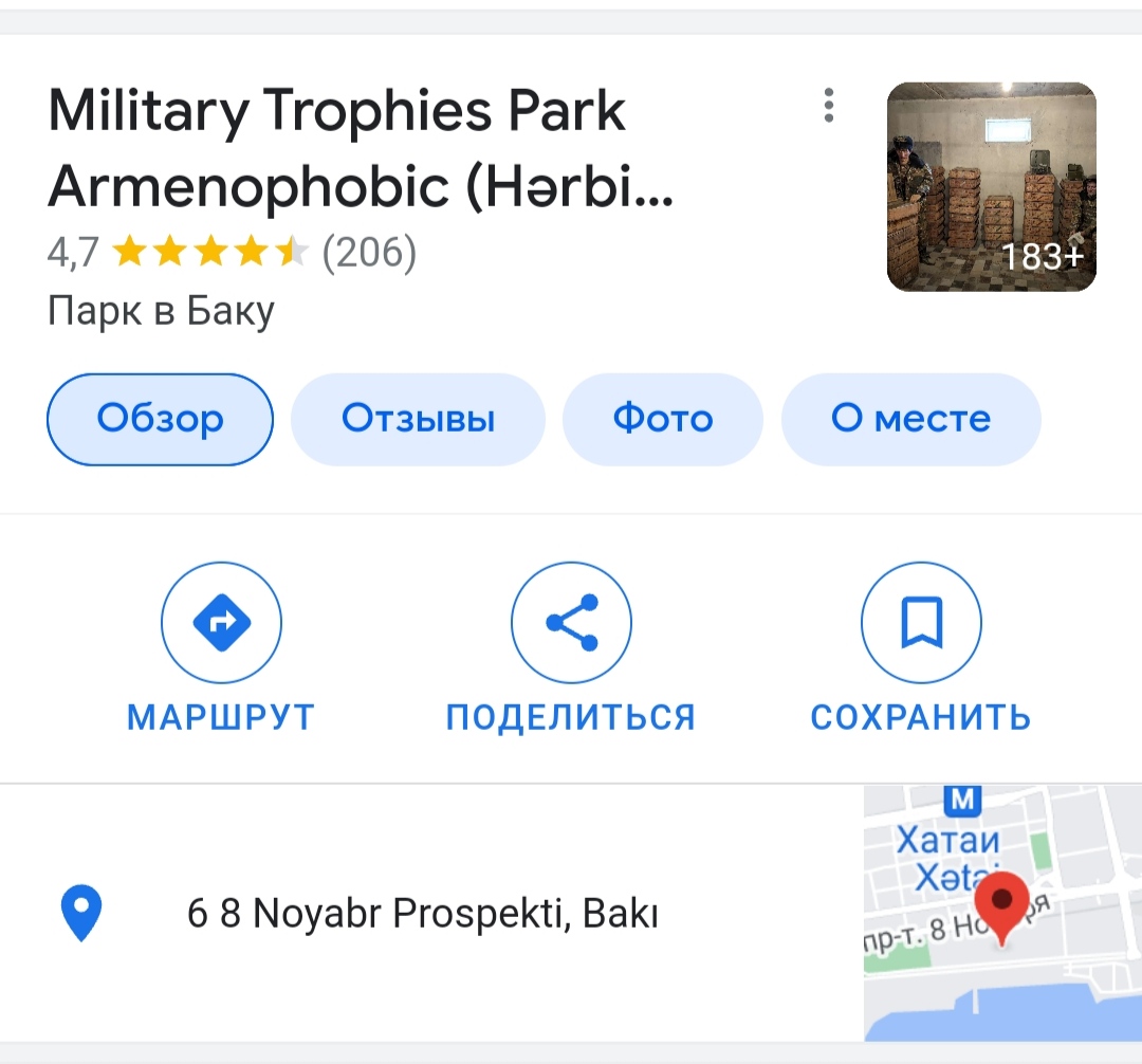 Google-un xəritələr bölməsində "Qənimətlər Parkı"-nı lokasiya seçdiyiniz zaman sözügedən yazı üzə çıxır.