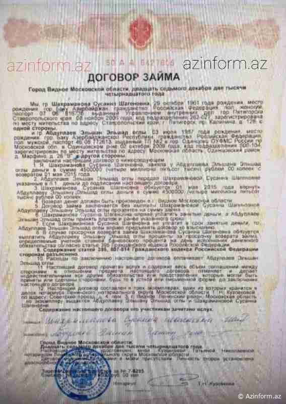 Azinform.az-ın əldə etdiyi materiallardan aydın olur ki, Elşən Abdullayev Ermənistanın keçmiş prezidenti Serj Sarkisyanın qızı arasında notarial qaydada borc müqaviləsi imzalanıb. MÜqaviləyə əsasən erməni qızına 4.5 milyon rus rublu civarında pul ödənib. Müqavilə şərtlərinə əsasən Sarkisyanın qızı bu pulu istənilən məqsədlər üçün xərcləyəcəyi mümkün hesab edilir.